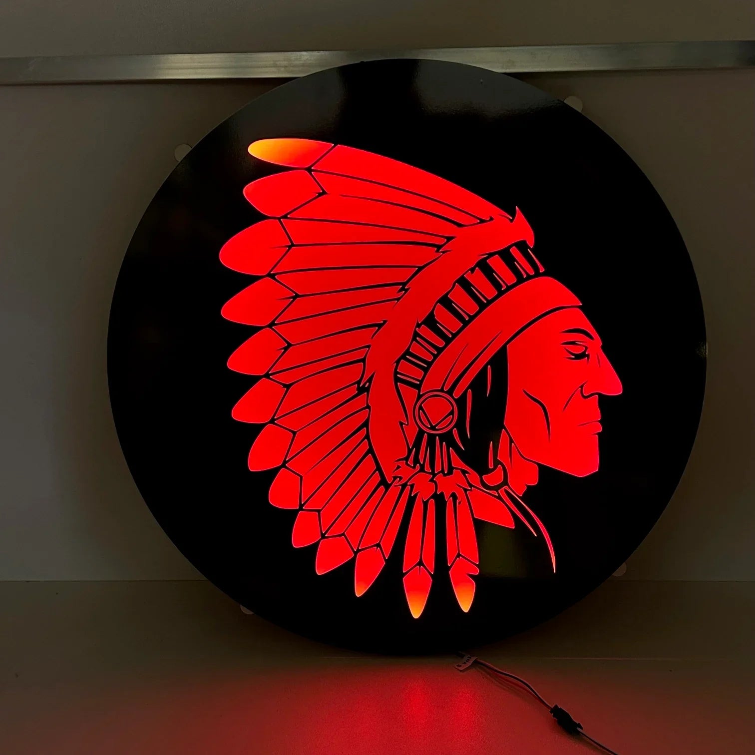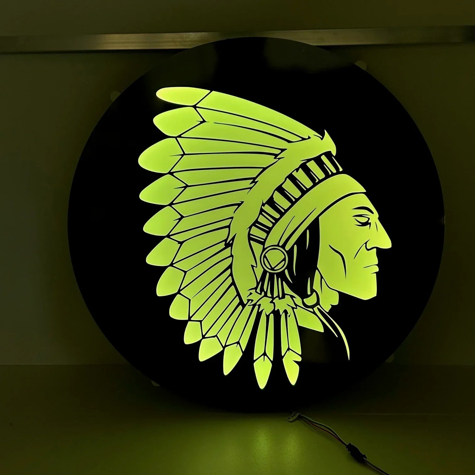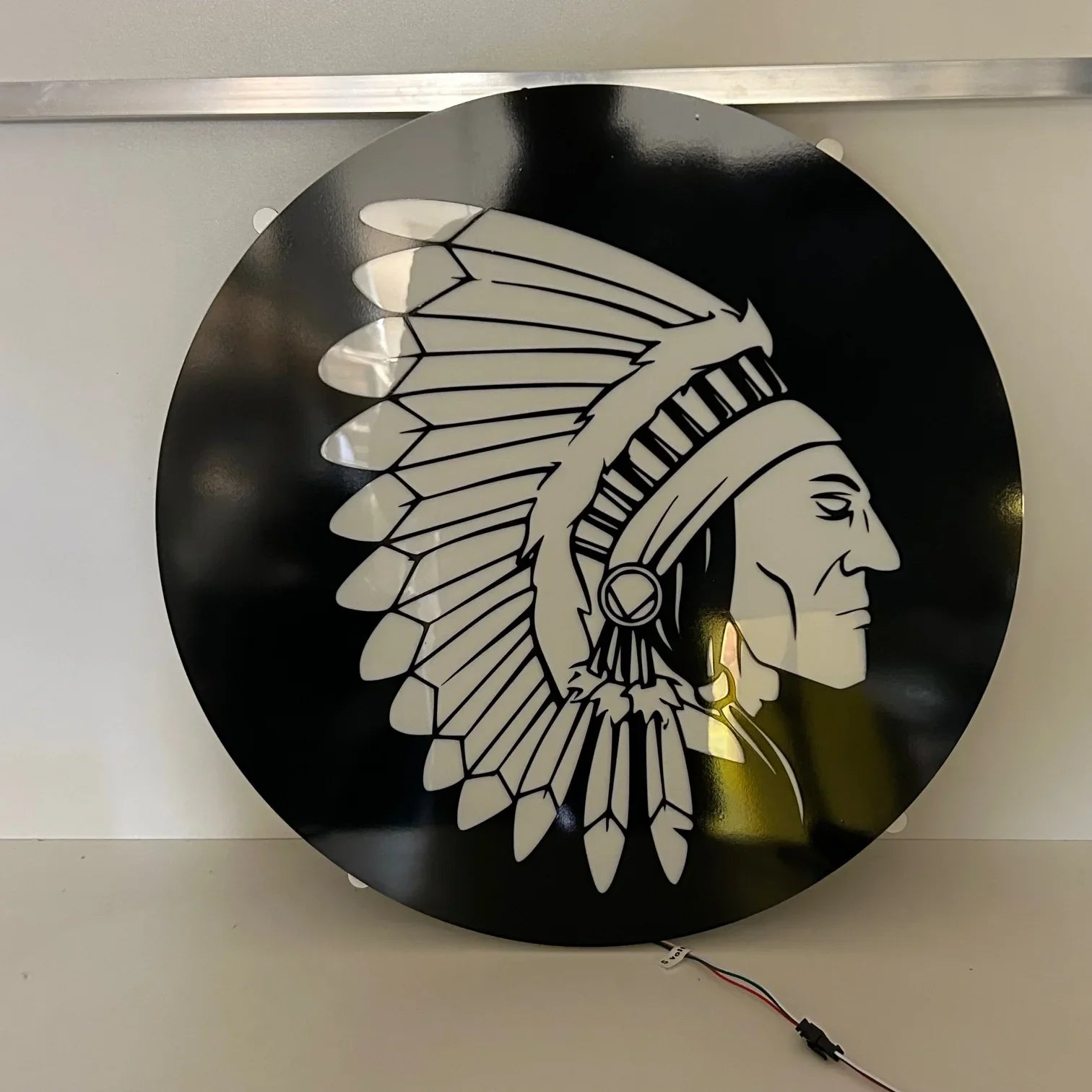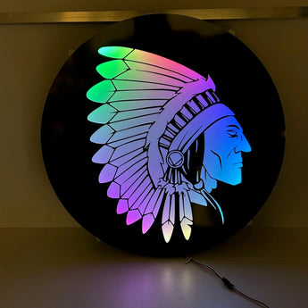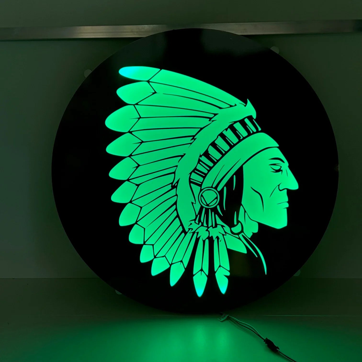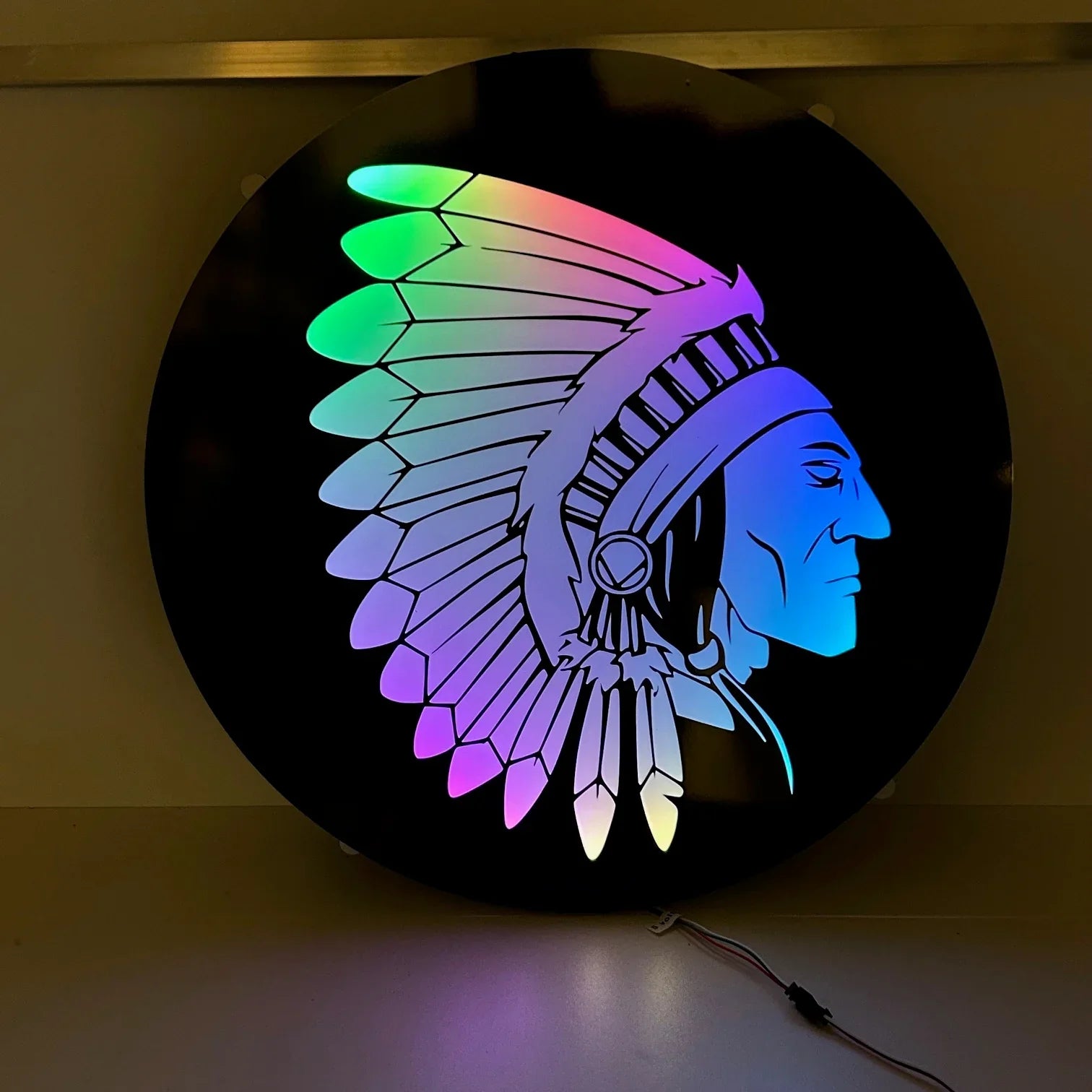 Decoupé avec précision sur plexiglas haut de gamme, il révèle une tête d’indien détaillée sublimée par un éclairage LED RGBW puissant et personnalisable.