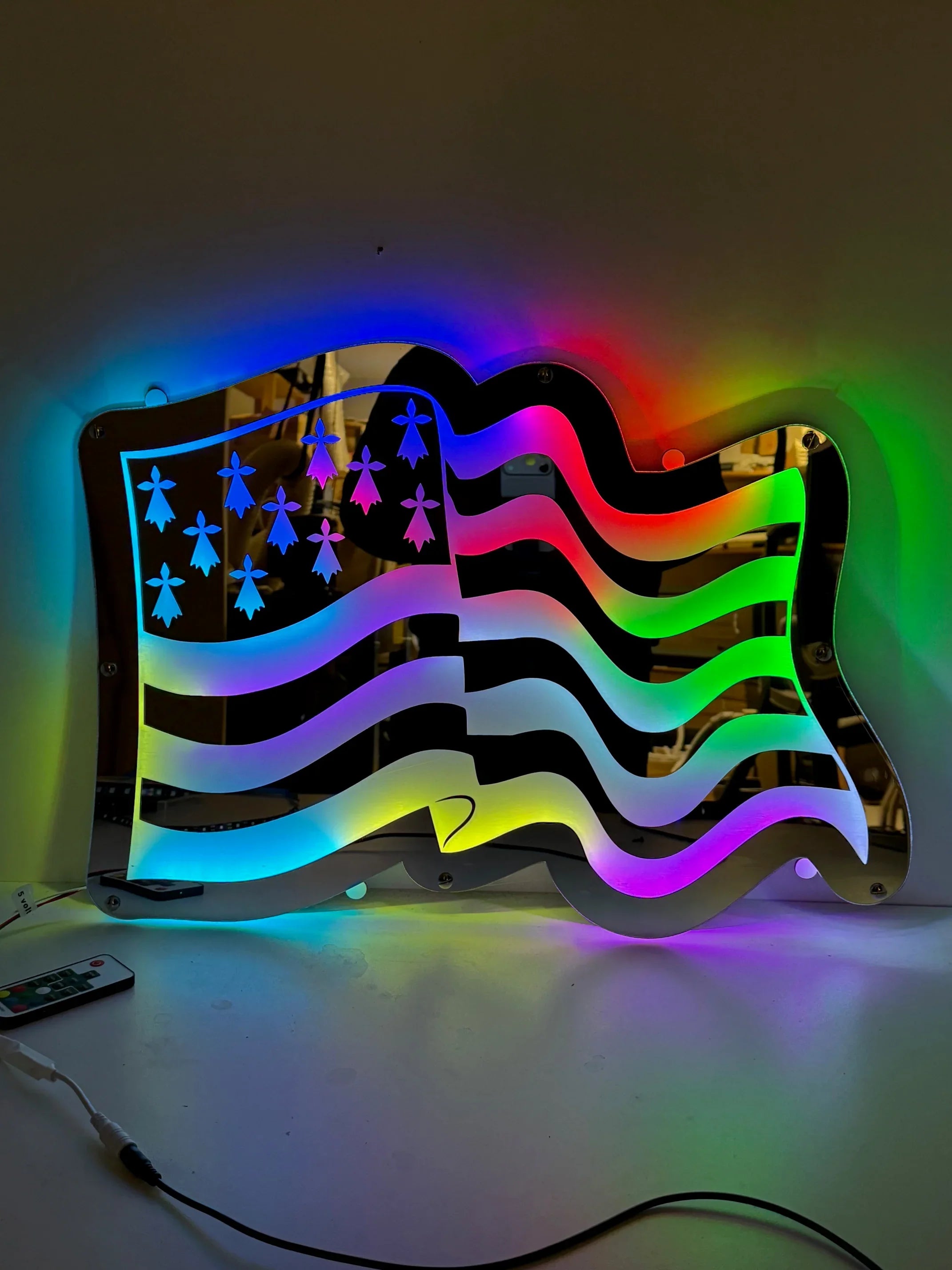 Ce fond de cabine camion personnalisé représente la carte de la Bretagne, gravée avec précision sur un plexiglas miroir de qualité. L’ensemble est illuminé par un éclairage LED 12V/24V/5V USB